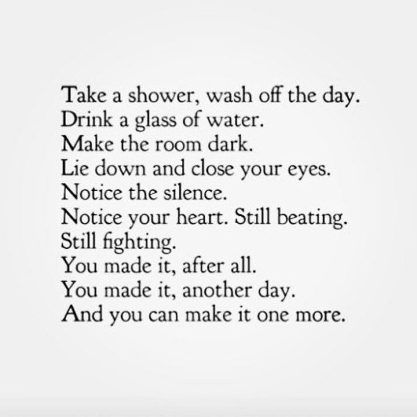 So tonight, I took a shower and I washed off the day. I drank water. I made my room dark. I’m getting ready to close my eyes and notice the silence. I made it through today and you know what? I’m going to make it through tomorrow.